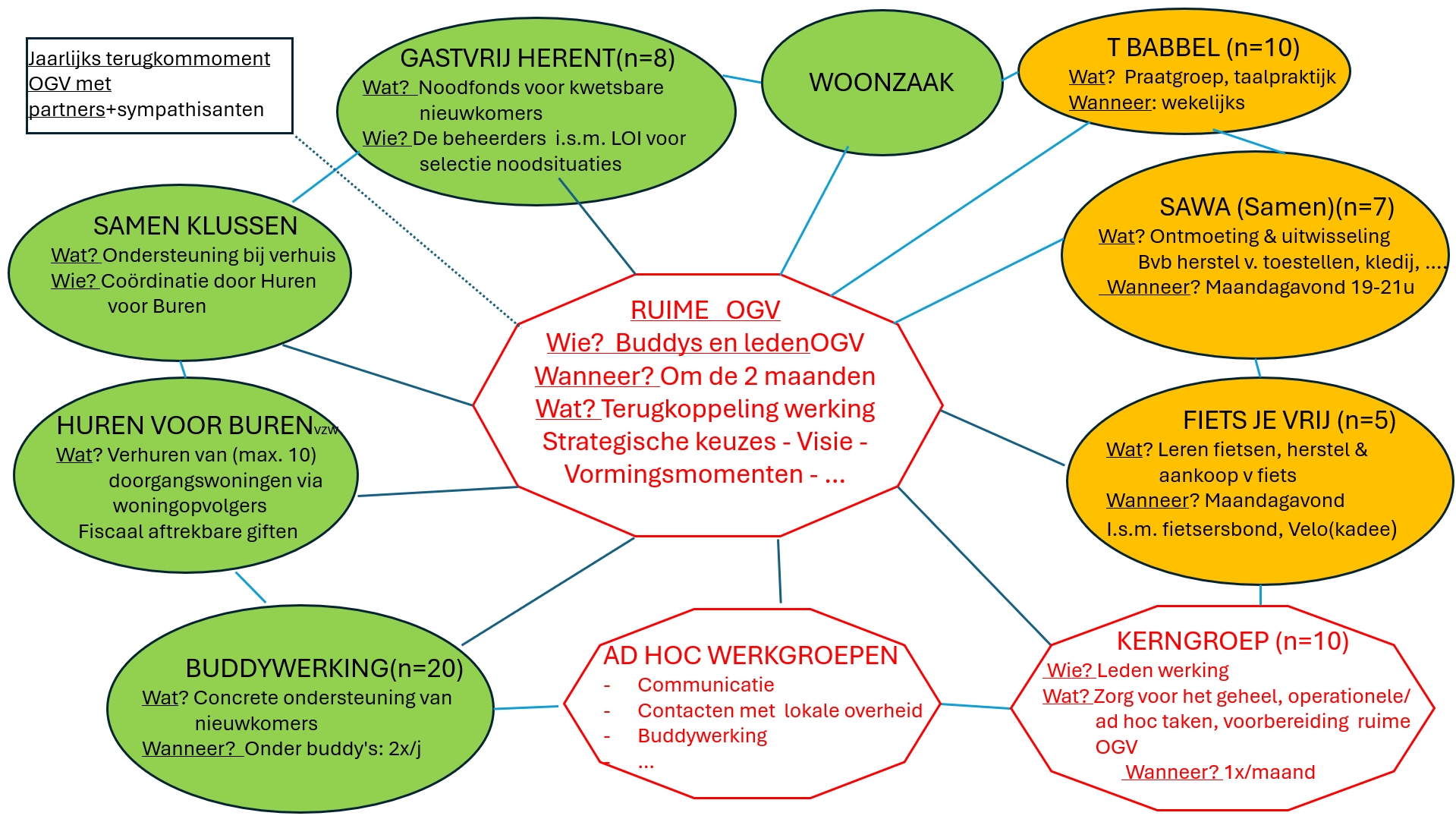 - We verwelkomen je ook graag om mee vorm te geven aan het geheel van de werking van de Onthaalgroep Vluchtelingen. Zie het organogram zoals het er vandaag uitziet. Zo hadden we in het voorjaar 2024 twee denkdagen over onze organisatie.